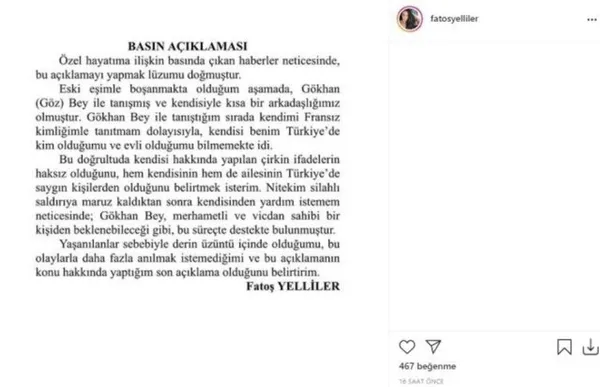 Sosyal medya hesabından bir basın açıklaması yayınlayan Yelliler şu ifadeleri kullandı: "Özel hayatıma ilişkin basında çıkan haberler neticesinde, bu açıklamayı yapmak lüzumu doğmuştur.
