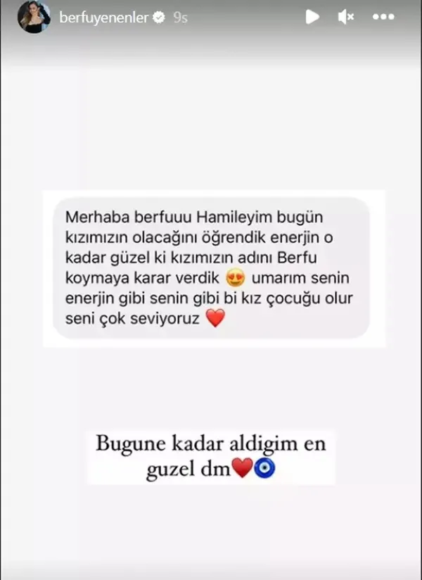"Merhaba Berfu. Hamileyim, bugün kızımız olacağını öğrendik. Enerjin o kadar güzel ki kızımızın adını Berfu koymaya karar verdik. Umarım senin enerjin gibi, senin gibi bir kız çocuğu olur. Seni çok seviyoruz"