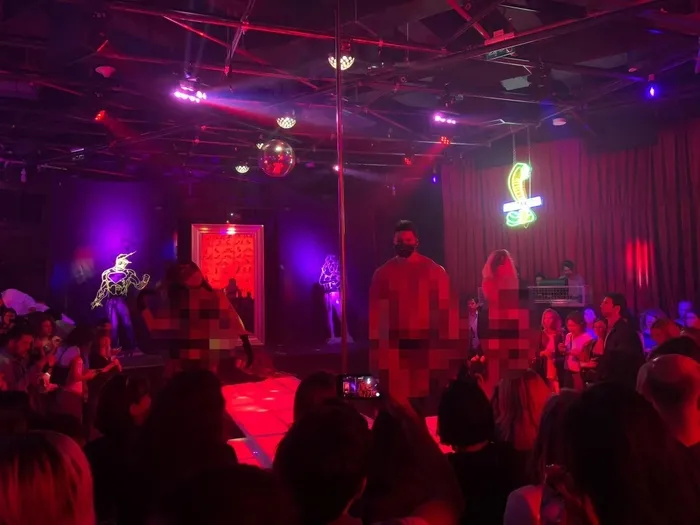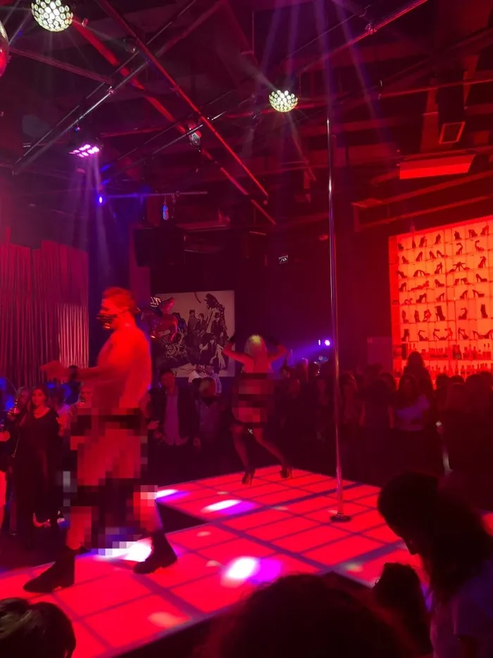 Kapıda sıkı bir güvenlik soruşturmasından geçen davetlileri içeride son derece erotik bir atmosfer karşıladı. Erkek ve kadın dansçılar striptiz yaptı, ardından direk dansı geldi.