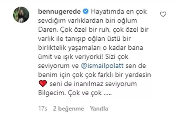 Çiftin sosyal medyada paylaştığı fotoğrafın altına Bennu Gerede yorum yapmıştı. Gerede, Gerede, fotoğrafa; "Hayatımda en çok sevdiğim varlıklardan biri oğlum Daren. Çok özel bir ruh, çok özel bir varlık ile tanışıp oğlan üstü bir birliktelik yaşamaları o kadar bana ümit ve ışık veriyor ki! Sizi çok seviyorum ve İsmail Polat sen de benim için çok çok farklı bir yerdesin. Seni de inanılmaz seviyorum Bilge'ciğim. Çok ve çok" şeklinde yorum yaptı.
