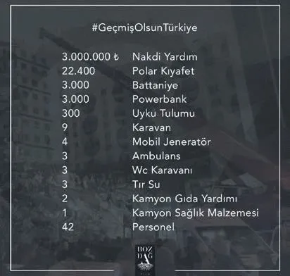 Bozdağ Film'in kurucusu Mehmet Bozdağ depremzedelere yolladıkları yardımları açıkladı. "Bozdağ Film olarak yaraları sarmak için setlerimizi durdurarak depremin ikinci günü yola çıktık. Bu zor günlerde depremzede vatandaşlarımızın ve devletimizin yanındayız" diyen Bozdağ, 3 milyon lira nakdi yardım yaptıklarını açıkladı.