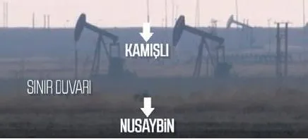 Fotoğrafta da görüldüğü gibi sınırdan sadece 5 metre ileride, Kamışlı'da petrol adeta fışkırmış ve bir sürü petrol kuyusu var. Türkiye'nin yıllık petrol ihtiyacının yarısı sınırımızdan sadece 5 metre ileride çıkıyor! Dün sosyal medyada 'Sınırın altında yanlamasına kazı yapalım' diyenler bile çıktı.