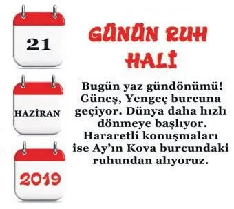 Haftanın son iş gününde işinizi başınızdan aşkın hissedebilir, fakat bir türlü güne konsantre olamayabilirsiniz. Sebebi ise çok basit; güneş, bugün Yengeç burcuna geçip yazın ilk gününü yaşatacak. Aynı zamanda en kısa gece olacak. 'Peki bu 24 saat yaz döngüsünü ve güneşin geçişine şahitlik ettirirken ne yapmalı?' derseniz; arınmayı, dinlenmeyi, yeni planlar yapmayı, en önemlisi de dua etmeyi sakın ihmal etmeyin.
