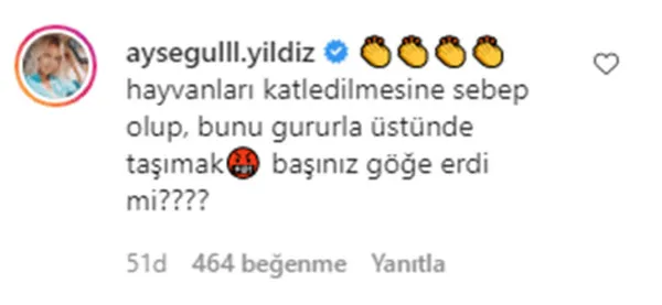 Öte yandan Diva'ya ilk tepki İbrahim Tatlıses'in eski eşi Ayşegül Yıldız'dan geldi. Yıldız, yaptığı yorumda, "Hayvanları katledilmesine sebep olup, bunu gururla üstünde taşımak. Başınız göğe erdi mi?" ifadelerini kullandı.