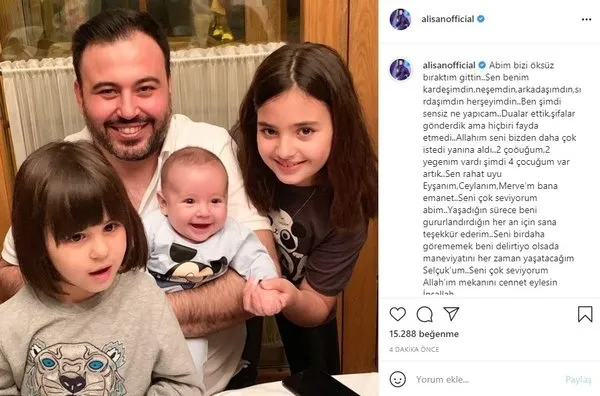 Bir an olsun yanından ayırmadığı kardeşinin ölümüyle yıkılan Alişan, cenaze sonrası sosyal medya hesabından bir veda paylaşımı yaptı. Abisinin çocuklarıyla çektirdiği bir fotoğrafı paylaşan şarkıcı, şunları yazdı: "Ağabeyim bizi öksüz bıraktın gittin... Sen benim kardeşimdin, neşemdin, arkadaşımdın, sırdaşımdın, her şeyimdin... Ben şimdi sensiz ne yapacağım? 2 çocuğum, 2 yeğenim vardı şimdi 4 çocuğum var artık. Sen rahat uyu; Eyşan'ım, Ceylan'ım, Merve'm bana emanet. Seni çok seviyorum ağabeyim... Yaşadığın sürece beni gururlandırdığın her an için sana teşekkür ederim. Seni bir daha görememek beni delirtiyor olsa da maneviyatını her zaman yaşatacağım Selçuk'um. Seni çok seviyorum, Allah'ım mekanını cennet eylesin inşallah..."