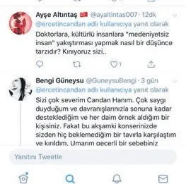 - 'Sizi çok severim Candan Hanım, çok saygı duyduğum ve davranışlarınızla sonuna kadar desteklediğim ve her daim örnek aldığım bir kişisiniz. Fakat bu akşamki konserinizde sizden hiç beklemediğim bir tavırla karşılaştım ve kırıldım. Umarım geçerli bir sebebiniz vardır.'