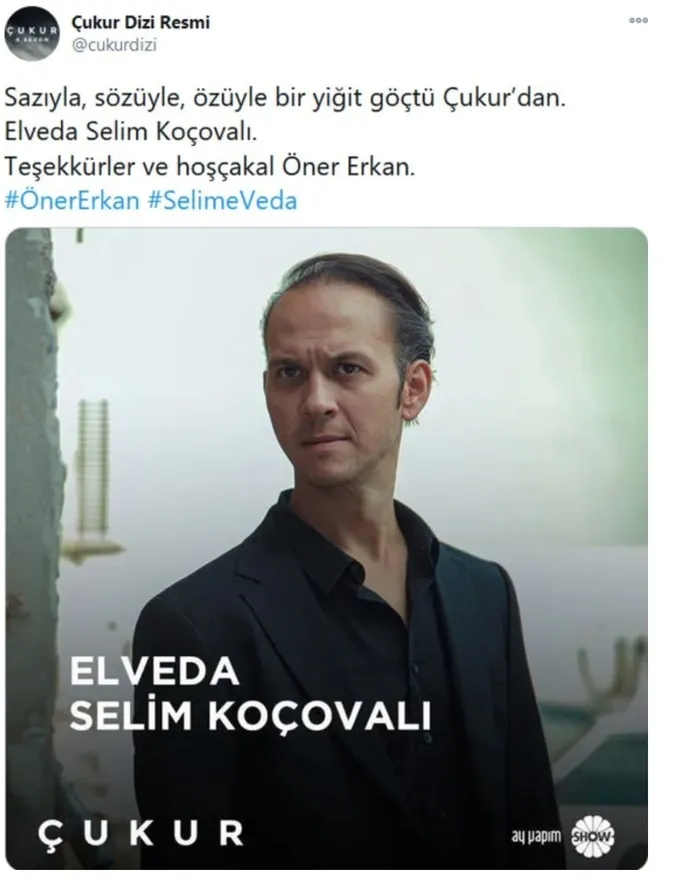 Çukur dizisinde Selim Koçovalı karakterini canlandıran Öner Erkan diziden ayrıldı. Dizinin son bölümünde Çağatay Erdenet tarafından öldürülen Selim Koçovalı'nın dramatik ölüm sahnesi ekranlara damgasını vururken, dizinin resmi sosyal medya hesabından Öner Erkan ile ilgili paylaşım da geldi! Çukur Selim öldü…