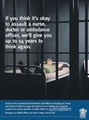 Görselini paylaştığım afişin Türkçe anlamı şöyle: 'Eğer bir hemşireye, doktora, ya da bir ambulans görevlisine saldırmakta bir sakınca olmadığını düşünüyorsanız, size tekrar düşünebilmeniz için 14 yıl zaman veriyoruz. (hapis cezası)' Avustralya hükümeti bu afişi devletin sağlık kuruluşlarına astı ve sosyal medya hesaplarından da duyurdu.