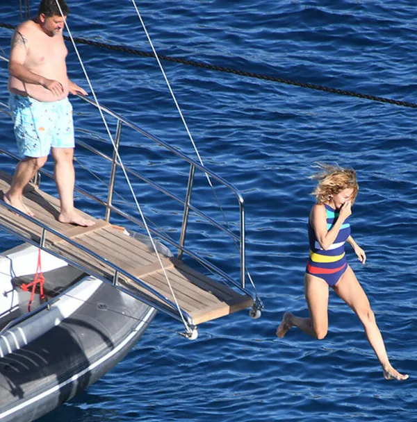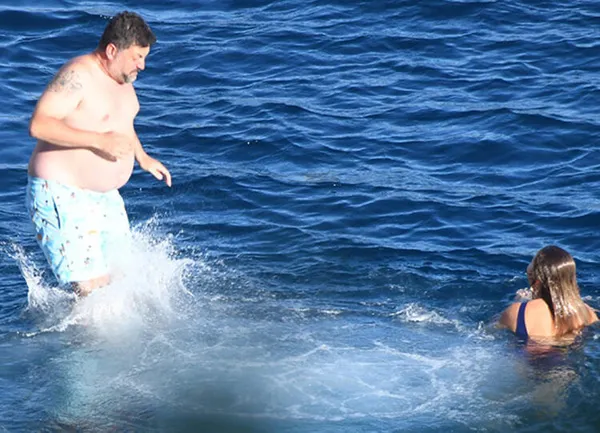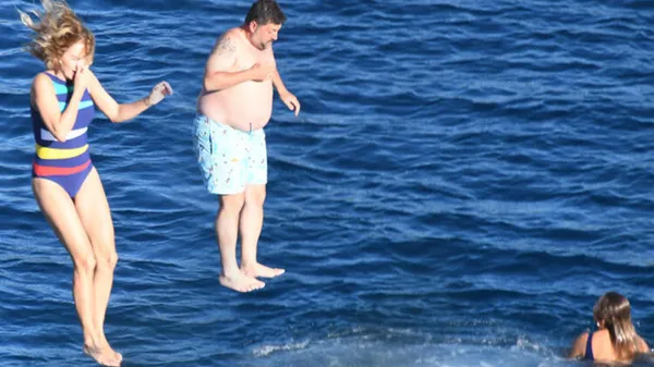 Tekne personeliyle konuşup talimatlar verdiği görülen Mahmutyazıcıoğlu'nun yanına güverteden çıkıp gelen Erken, teknenin arka kısmından sevgilisiyle denize atladı.