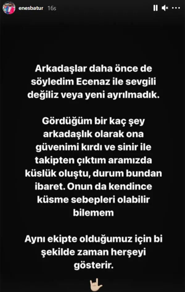 "Arkadaşlar daha önce de söyledim; Ecenaz ile sevgili değiliz veya yeni ayrılmadık. Gördüğüm birkaç şey arkadaşlık olarak ona güvenimi kırdı ve sinirle takipten çıktım. Aramızda küslük oluştu. Durum bundan ibaret. Onun da kendi küsme sebepleri olabilir bilemem. Aynı ekipte olduğumuz için bir şekilde zaman her şeyi gösterir."