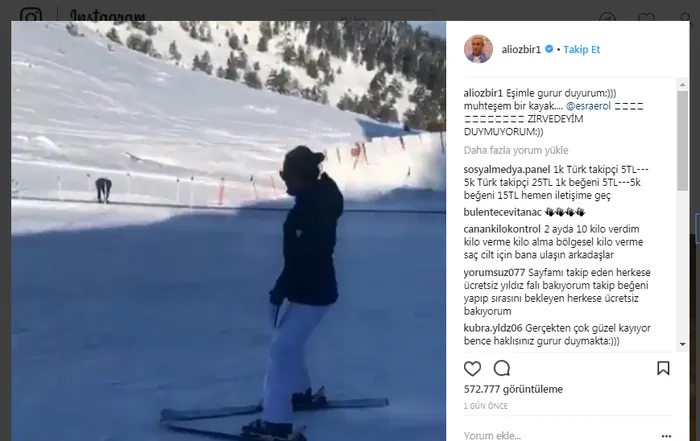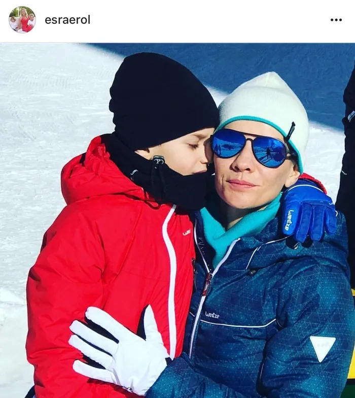Eşi Ali Özbir ise sosyal medya hesabından "Eşimle gurur duyurum:))) muhteşem bir kayak @esraerol ZİRVEDEYİM DUYMUYORUM:))" diyerek o anları instagram hesabından paylaştı.