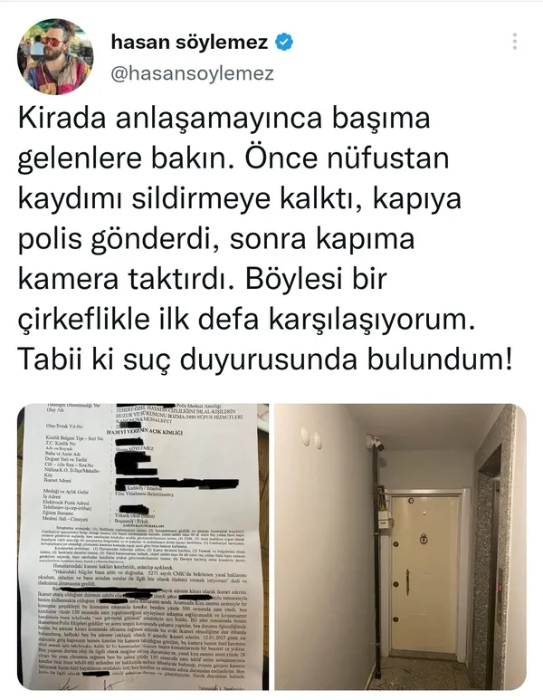 Söylemez, "12.01.2023 günü ise dairemin giriş kapısının hemen üzerine bir kamera takıldığını gördüm, bu kamera benim özel hayatımı ihlal etmek için takılmıştır, kaldı ki bu kameradan binanın başka konumlarında bir benzeri de yoktur. Ben yaşanan olay ile ilgili olarak mağdur olmuş durumdayım. Yasal kira zammı sınırı yüzde 28 civarı bir oran olmasına rağmen ben bu şahsa yüzde 150 oranında zam teklif ettim anlaşamayınca kendisi beni önce tehdit etti ardından ise hakkımda asılsız ihbarlarda bulunup, evimin girişine kamera taktırarak bizim özel hayatımıza müdahale etti, ben kendim ve ailemin adına durumdan endişeliyim. Ben konu ile ilgili olarak isimli şahıstan davacı ve şikayetçiyim" ifadelerini kullandı.