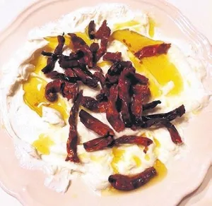 YAPILIŞI: Kurutulmuş kırmızı biberi haşlayıp çekirdeklerini ayıklıyoruz ve ikiye kesiyoruz. Patatesleri soyup dilimliyoruz ve kızartıyoruz. Haşladığımız biberleri de kızartıyoruz. Tabağa önce sarımsaklı yoğurdu yayıyoruz ve üzerini kızarttığımız biberlerle kapatıyoruz. Biberlerin de üzerine kızarmış patatesleri diziyoruz ve servis ediyoruz.
