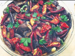 YAPILIŞI: Öncelikle kurutulmuş patlıcan, domates ve biberi tencerede haşlıyoruz. Yumuşadıktan sonra süzgece koyup süzülmesini bekliyoruz. Patatesleri halka halka doğrayıp kızartıyoruz. Yarım halka doğradığımız soğanları ve rendelenmiş sarımsağı yağda kavuruyoruz ve biber salçasını ekliyoruz. Salça da kavrulduktan sonra rendelenmiş domatesi ekleyerek biraz pişiriyoruz. Fırın kabının en altına patatesleri diziyoruz, üzerine haşladığımız sebzeleri koyup sosu döküyoruz. Önceden ısıtılmış 175 derecelik fırında pişiriyoruz.