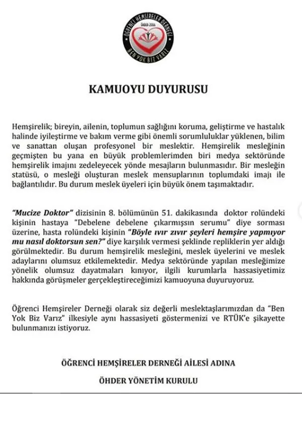 Mucize Doktor dizisinin son bölümünde, doktor rolündeki kişinin hastaya "Debelene debelene çıkarmışsın serumu" ifadesinden sonra hastanın "Böyle ıvır zıvır şeyleri hemşire yapmıyor mu, nasıl doktorsun sen?" repliğinin ardından Öğrenci Hemşireler Derneği ailesi adına ÖHDER Yönetim Kurulu bir kamuoyu açıklaması yayınlandı.