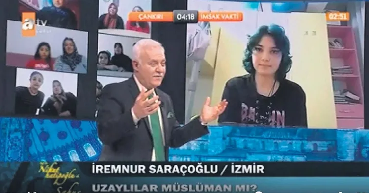 Nihat Hatipoğlu ile İftar ve Sahur programlarına, özellikle gençlerin yoğun ilgisi var. Önceki akşam yayına Zoom üzerinden yapılan bağlantıyla konuk olan İremnur Saraçoğlu adlı genç kızın ilginç sorusu Hatipoğlu'nu güldürdü. Saraçoğlu, "Uzaylılar Müslüman mıdır?" diye sordu.