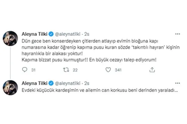 Ünlü şarkıcının ailesi, takıntılı hayranı kapıda görünce büyük şok yaşayarak güvenliği çağırdı. Konserden sonra olayı öğrenen Aleyna Tilki, takıntılı hayranından şikayetçi oldu.