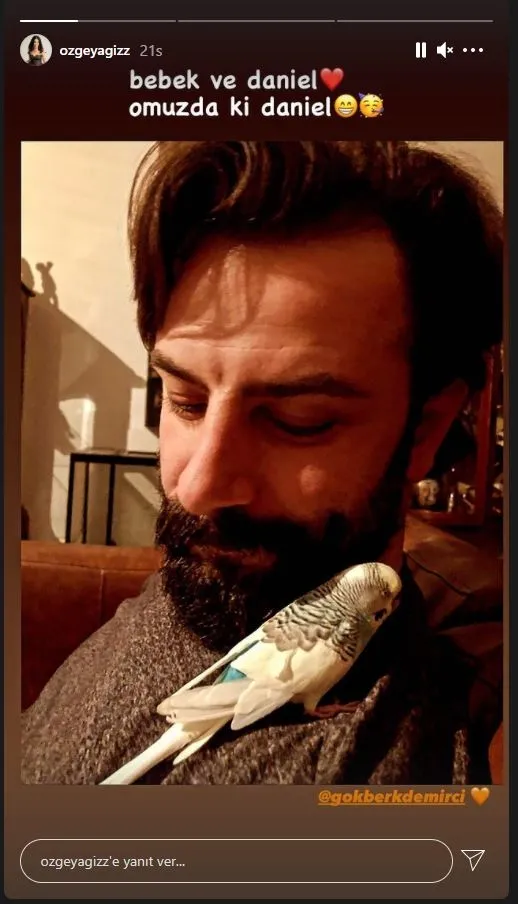 Diğer yandan Özge Yağız, Gökberk Demirci'nin 'Daniel' adında bir muhabbet kuşuyla olan pozunu Instagram story'sinden yayınladı. "Bebek ve Daniel, omuzdaki Daniel" notunu düştüğü paylaşımına kalp emojisi eklemeyi de ihmal etmedi. Güzel oyuncunun sevgilisi Gökberk Demirci için bebek ifadesini kullanması ise dikkatlerden kaçamadı...