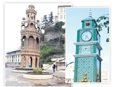 Giresun'da Rumlara ait eski çan kulesinden esinlenerek inşa edildiği iddia edilen saat kulesi (solda), halktan tepki alınca yıkılmış ve yerine yeni saat kulesi (sağda) inşa edilmiş.