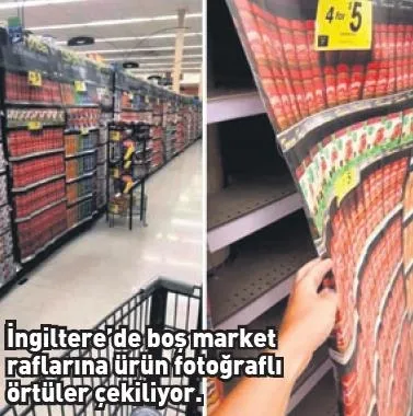 İngiltere'de TIR ve kamyon şoförü eksikliğinden kaynaklanan tedarik sorunları hem benzin kıtlığına hem de süpermarket raflarının boş kalmasına neden olmaya devam ediyor. Ünlü süpermarket zinciri Tesco, boş rafların oluşturduğu kötü görüntüyü gizlemek için ürünlerin fotoğraflarının yer aldığı örtülerle rafları kapatmaya başladı.