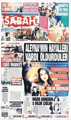 Aleyna Ağgül'ün sır ölümünü 4 Ekim günü sadece SABAH gazetesi 1. sayfada manşet yaptı. Olay Hürriyet, Karar ve Posta'da birinci sayfada küçük bir haber olarak yer aldı. Diğer gazetelerin birinci sayfasında Aleyna'yla ilgili habere rastlamadım. Kadın cinayetlerine duyarlı muhalif gazetelerin birinci sayfasında bu önemli haberin yer almaması şaşırtıcı.