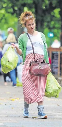 Ünlü oyuncu Helena Bonham Carter, önceki gün Londra'da görüntülendi. Bir marketten alışveriş yapan İngiliz oyuncu; yeşil hırkası, kırmızı- beyaz çizgili eteği, mavi spor ayakkabıları ve gri çoraplarıyla karmakarışık bir görünüm sergiledi. Carter, poşetlerini taşımakta zorlanınca yolda sık sık durup mola verdi.