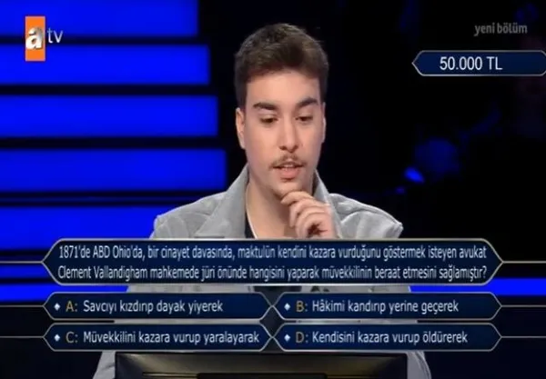 Yarışmayı cazip kılan en büyük etkenlerden biri de soruların ilginçliği. Cuma akşamı yarışmada yine şahane bir soru vardı: "1871'de ABD Ohio'da, bir cinayet davasında, maktulün kendini kazara vurduğunu göstermek isteyen avukat Clement Vallandigham mahkemede jüri önünde hangisini yaparak müvekkilinin beraat etmesini sağlamıştır? a) Savcıyı kızdırıp dayak yiyerek b) Hakimi kandırıp yerine geçerek c) Müvekkilini kazara vurup yaralayarak d) Kendisini kazara vurup öldürerek..."