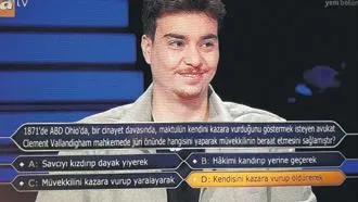 Yarışmacının da bildiği doğru cevap "d" şıkkıymış meğer. Yani avukat, celse sırasında kendini kazara vurup öldürüvermiş. Bilmiyordum. Vallahi bir yaşıma daha girdim...