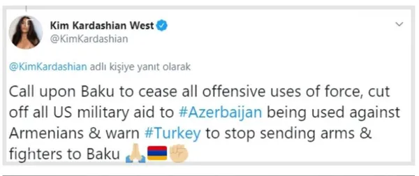 Kardashian paylaşımında ayrıca, "Bakü'ye saldırgan güç kullanımını durdurması için çağrı yapılmalı, Azerbaycan'a ABD askeri yardımı durmalı. Türkiye, Bakü'ye silah ve savaşçı göndermemesi için uyarılmalı" ifadelerini kullandı.