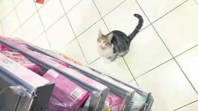 Reyon önünde kılıktan kılığa giren tatlı kedi, bazen topallıyor, bazen sürünüyor, bazen de hasta gibi miyavlıyor. Müşteriler ise reyon önünde acınası halde gördükleri bu kediye bir paket mama almadan geçemiyor.