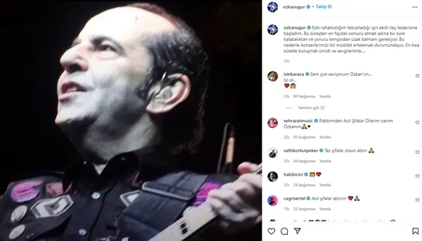 Yaşadığı süreçten bahseden Özkan Uğur, "Eski rahatsızlığım tekrarladığı için akıllı ilaç tedavisine başladım. Bu süreçten en faydalı sonucu almak adına bir süre kalabalıktan ve yorucu tempodan uzak kalmam gerekiyor. Bu nedenle konserlerimizi bir müddet ertelemek durumundayız. En kısa sürede buluşmak ümidi ve sevgilerimle" ifadelerini kullandı.