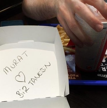 Şarkıcı, sipariş verdiği hamburger kutusunun içinde 'Murat bir tanesin' yazısıyla karşılaşınca yaşadığı şaşkınlığı "Hamburgeri bir açtım ki…" notuyla sevdiklerine iletti.