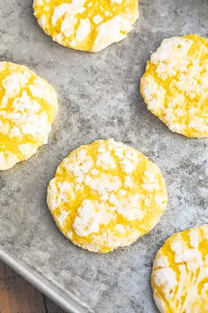 Yumuşamış yağ ile pudra şekerini yoğuruyoruz. Sonra diğer malzemeleri ekleyip yumuşak bir hamur elde ediyoruz. Yuvarlak şekil verip önce çırpılmış yumurta akına, sonra limon kabuğuna batırıyoruz. Tepsiye dizip 180 derece fırında kızarana kadar pişiriyoruz.