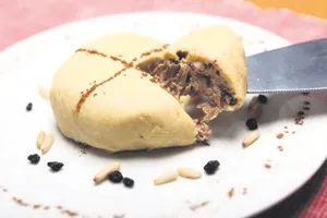 İlk önce piyazlık doğradığımız soğanlarımızı bir tavaya koyup üzerine tuz ve şekeri ilave ederek kavuruyoruz. Kuş üzümünü ve fıstığı da ekleyip 1-2 dakika daha çeviriyoruz. Bir bardak su koyup kapağını kapatıyoruz. Yarım su bardağı tahini ekliyoruz. Nohutların kabuklarını çıkartıyoruz. Haşlanmış patatesleri de ekleyip rondodan geçiriyoruz. Üzerine yarım su bardağı tahini ve tuzu ekleyip hamur haline getiriyoruz, 5-6 parçaya ayırıyoruz. Streç filmi iki kat yapıp hamurları avuç içimiz kadar parmaklarımızla açıp içine soğanlı harcı koyup top şeklini veriyoruz. Üzerine isteğe göre limon suyu ve tarçın ekleyip servis ediyoruz.