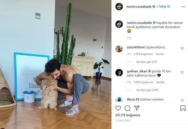 Yaklaşık iki aydır aynı dizide yer aldığı Gökhan Alkan ile birliktelik yaşayan Nesrin Cavadzade, sevgilisinin ev halini sosyal medya hesabından yayınladı. Sevgilisi Gökhan Alkan'ın fotoğrafını Instagram hesabından paylaşan güzel oyuncu yaptığı esprili yorumla takipçilerini güldürdü.