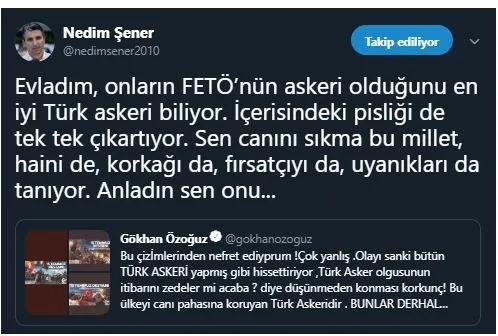 Nedim Şener'de kendisine 'Evladım, onların FETÖ'nün askeri olduğunu en iyi Türk askeri biliyor. İçerisindeki pisliği de tek tek çıkartıyor.