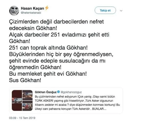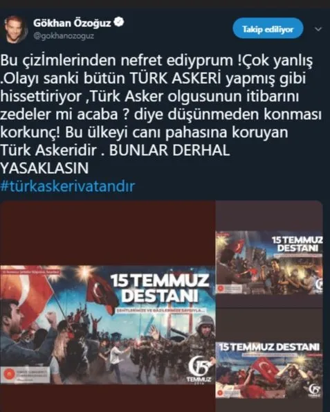 Gökhan Özoğuz'un, 251 kişinin şehit, 2194 kişinin gazi olduğu, Türk milletinin hainlere karşı verdiği 15 Temmuz mücadelesi için hâlâ 'tiyatro' kelimesini kullanabilmesi, durumun vahametini daha da ortaya koyuyor. Bir sanatçı olarak eli kanlı terör örgütünün içimize kadar sızdığı, 15 Temmuz günü milletimizin canıyla kanıyla vatan ve bayrak için verdiği mücadele için böyle bir kelime kullanmaktan utanmalısın Gökhan...
