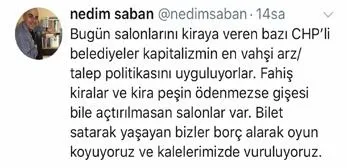 Tiyatrocu Nedim Saban, bazı meslektaşlarının "CHP'li belediyeler sayesinde artık salonlarda oyunlarımızı rahatça oynayacağız" açıklamalarına tepki gösterdi. Saban; Twitter'a, "CHP'li belediyeler kapitalizmin en vahşi arz talep politikasını uyguluyor" diye yazdı.