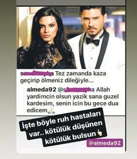 Oyuncu Tolgahan Sayışman'ın eşi Almeda Abazi'ye hediye ettiği araba olay oldu. Beykoz'daki 8 milyon TL'lik villasının garajında iki motosikleti bulunan Sayışman, geçtiğimiz günlerde 1 milyon 700 bin TL'ye son model bir cip aldı. Eşine de aynı markanın 1 milyon 300 bin TL'lik modelini hediye eden Sayışman'a sosyal medyadan çirkin yorumlar geldi. Almeda, bir takipçisinin yaptığı "Tez zamanda kaza geçirip ölmeniz dileğiyle" yorumuna sert cevap verdi: "İşte böyle ruh hastaları var. Kötülük düşünen kötülük bulsun."
