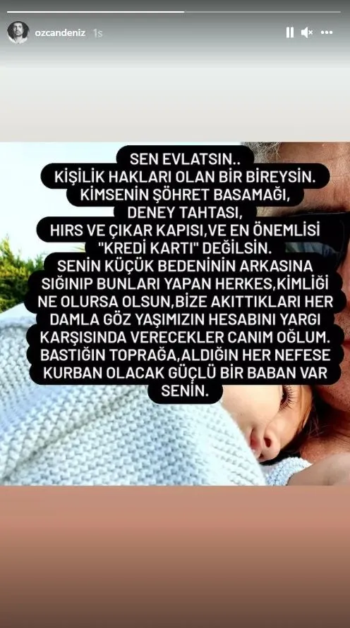 "Sen evlatsın... Kişilik hakları olan bir bireysin. Kimsenin şöhret basamağı, deney tahtası, hırs ve çıkar kapısı ve en önemlisi 'kredi kartı' değilsin. Senin küçük bedeninin arkasına sığınıp bunları yapan herkes, kimliği ne olursa olsun bize akıttıkları her damla gözyaşımızın hesabını yargı karşısında verecekler canım oğlum. Bastığın toprağa, aldığın her nefese kurban olacak güçlü bir baban var senin..."