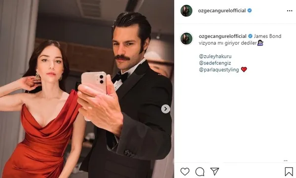Arkadaşlarının düğününe katılan Serkan Çayoğlu ile Özge Gürel, düğüne gitmeden birlikte poz verdi. Ünlü çift, sosyal medya üzerinden paylaştıkları fotoğrafın altına, "James Bond vizyona mı giriyor dediler?" ifadelerini kullandı.
