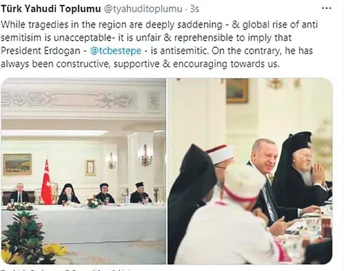 Türk Yahudi Toplumu'nun sosyal medya hesaplarından yapılan açıklamada, "Cumhurbaşkanı Erdoğan'ın Yahudi karşıtı olduğunu öne sürmek çok haksız ve çok ayıptır. Tam tersine kendisi bize karşı her daim yapıcı, destekleyici ve teşvik edici olmuştur" ifadeleri kullanıldı.