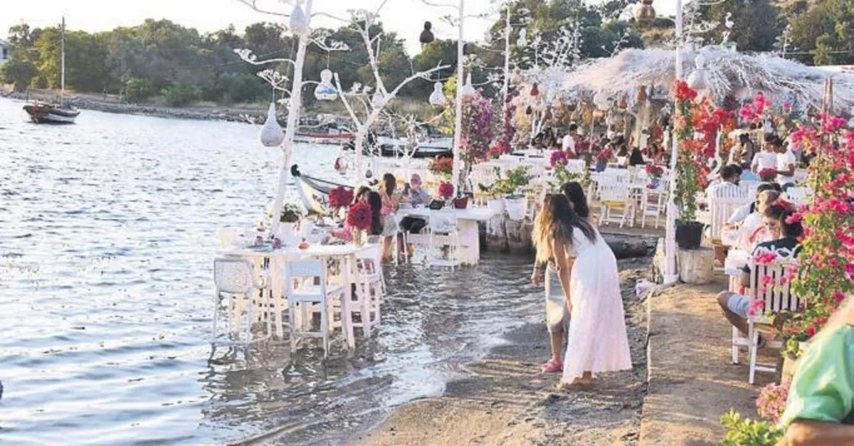 Bodrum Gümüşlük, evlilik yıldönümü kutlamak ya da evlilik teklifi yapmak isteyenlerin adresi oldu. Denize atılan masayı tercih eden aşıklar, kişi başı yaklaşık 1.500 lira hesap ödeyerek romantizmin zirvesine ulaşıyor. Özellikle günbatımında bu masa paylaşılamıyor.