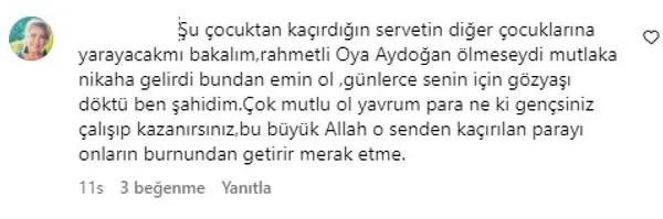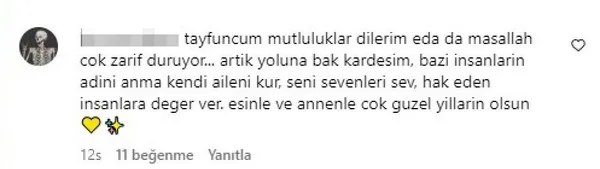 Tayfun Erdoğan da "Eee amca demek baba yarısı demek ağabeyim. Bu mutlu günümde dünya evine girerken, benim nikâh şahidim olduğun için teşekkür ederim. Sözü çok güzeldi, 'Babasıyla bir amca - baba yarısı oynamıştık, şimdi oğlunun hem amcası hem ağabeyiyim' dedi iyi ki varsın" demişti.
