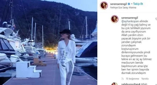 Son yaptığı paylaşımlarda adeta bir deri bir kemik kaldığı görülen Seren Serengil kendisine gelen yorumlara "Elimde değil 4 kg yağ kalmış ve bu çok tehlikeli yiyorum da ama zayıflıyorum" yanıtını verdi.