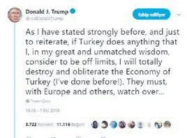 Eğer Türkiye eşsiz bilgeliğim içinde sınırları aşma olarak değerlendireceğim bir şey yaparsa, daha önce yaptığım gibi Türkiye ekonomisi mahvedip yok edeceğim. Türkiye Avrupa ve diğerleri ile beraber olmalı, bekliyorum" diye tweet attı.