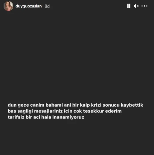Özaslan açıklamasında, "Dün gece babamı ani bir kalp krizi sonucu kaybettik. Baş sağlığı mesajlarınız için çok teşekkür ederim. Tarifsiz bir acı hala inanamıyoruz." İfadelerini kullandı.