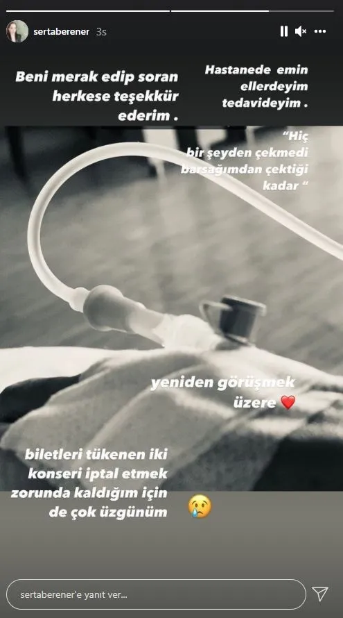 Basına yansıyan haberlerin ardından ünlü şarkıcıdan ilk açıklama geldi. Sertab Erener, "Beni merak edip soran herkese teşekkür ederim. Hastanede emin ellerdeyim, tedavideyim. Yeniden görüşmek üzere" dedi.