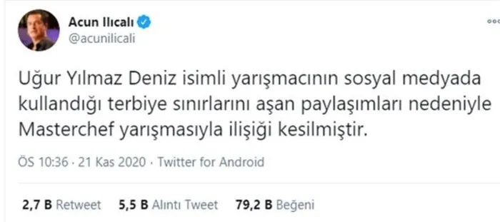 MasterChef'in başarılı yarışmacılarından olan Uğur Yılmaz'ın ırkçı ve hakaret dolu paylaşımları nedeniyle büyük tepki çekmişti. Programın yapımcısı ve kanal sahibi Acun Ilıcalı, paylaşımları görünce MasterChef Uğur'un programla ilişiğinin kesti.
