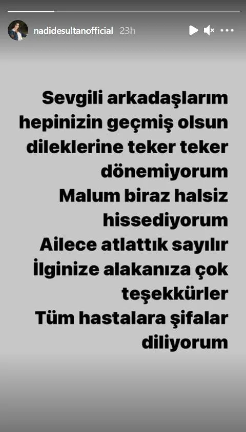 Sosyal medya hesabından sağlık durumu hakkında açıklama yapan Nadide Sultan Yonat, "Kendimi biraz halsiz hissediyorum. Ailece atlattık sayılır. Tüm hastalara şifa diliyorum" dedi.